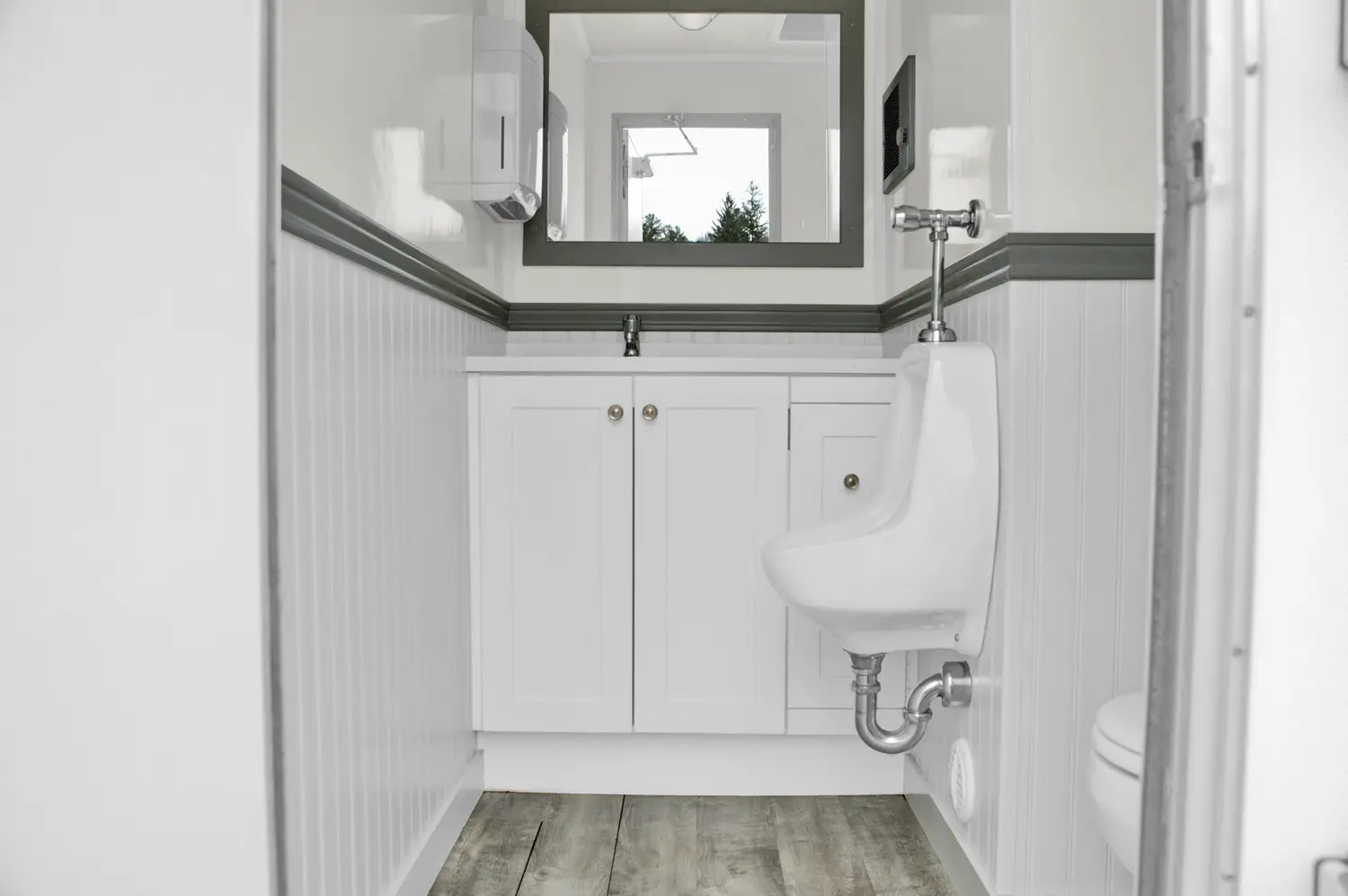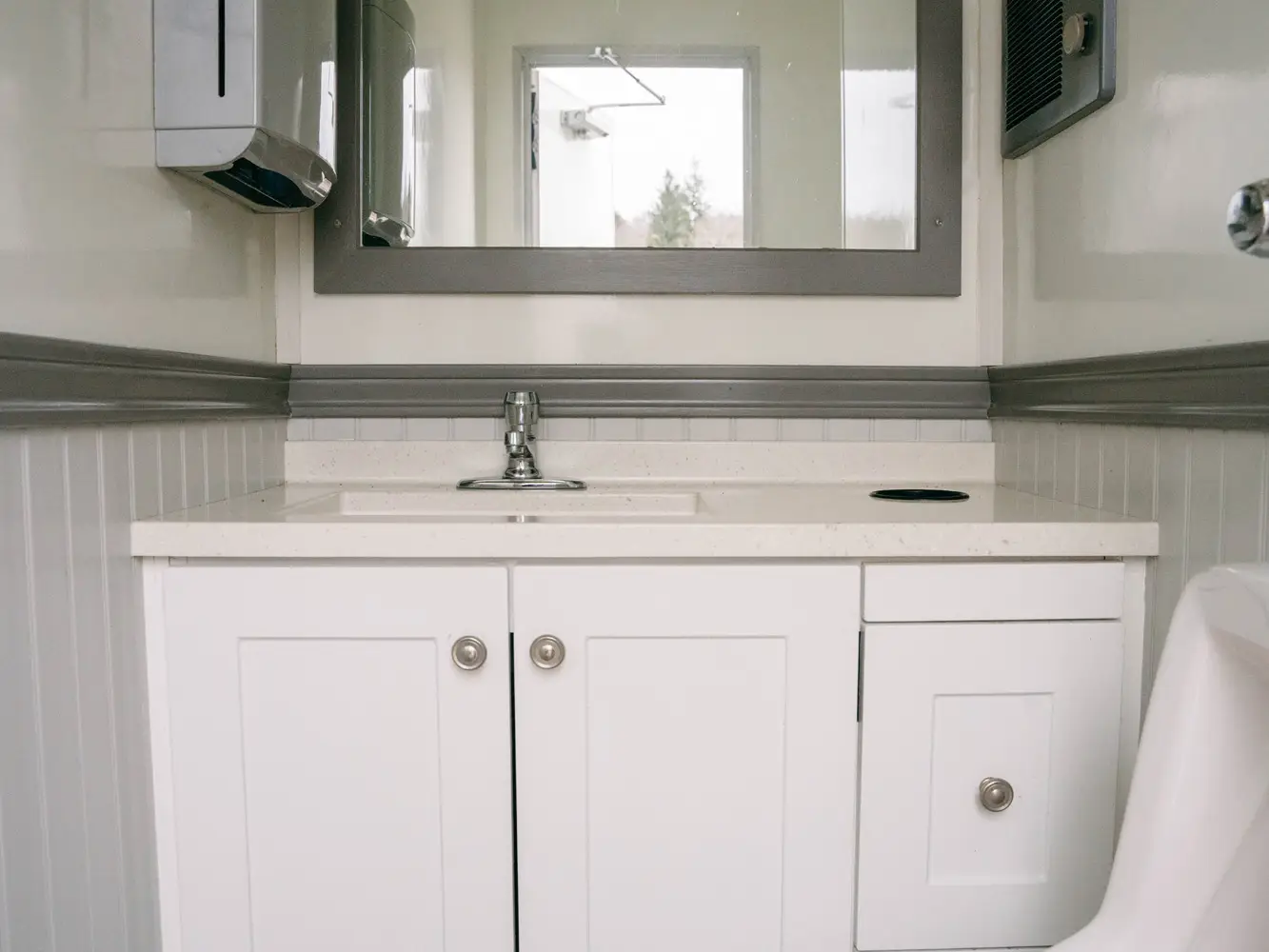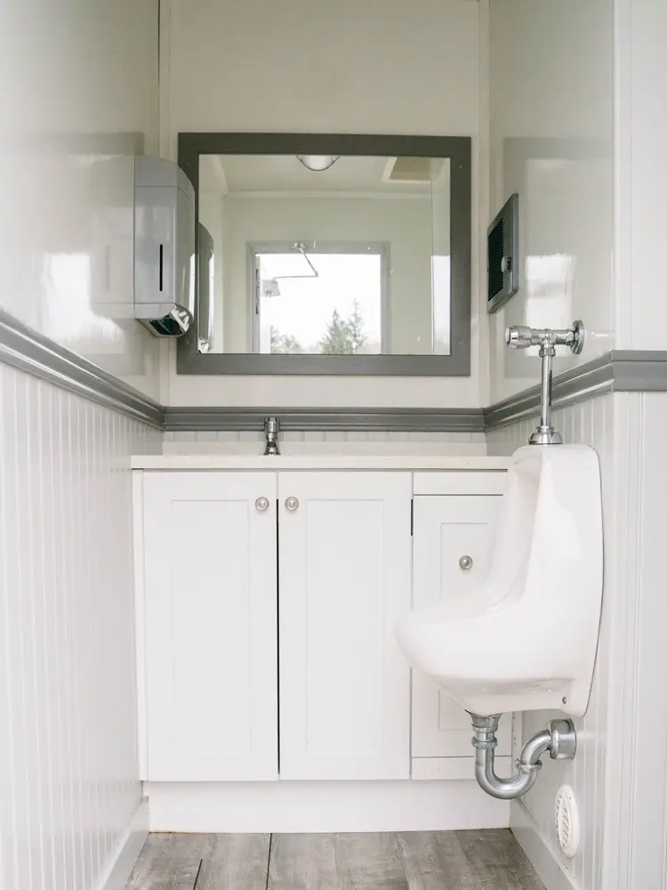 - 1 private stall, 1 urinal, 1 vanity, 1 sink
